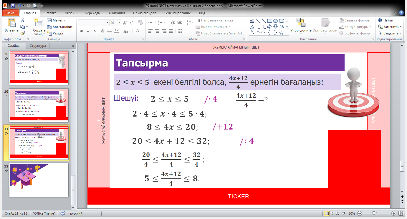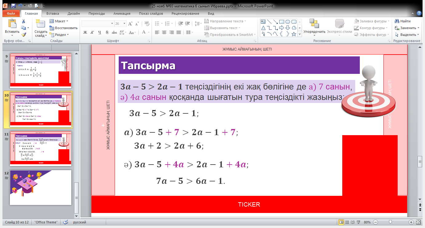 Білім алушылар тура санды теңсіздіктердің қасиеттерін біледі және қолданады, теңсіздіктерді қосу, азайту, көбейту және бөлуді түсінеді және қолдана біледі. Тапсырмалар орындау барысында бағытталған сұрақтар қою арқылы өмір бойы білім алуға үйренеді, сонымен қатар өзіне деген сенімділікті, ойын ашық жеткізе мүмкіндік беріледі, бір-бірімен ой бөлісуге, бір-бірінің пікіріне құрметпен қарауға, ынтымақтастыққа, өзара қарым-қатынасқа тәрбиелейді. |