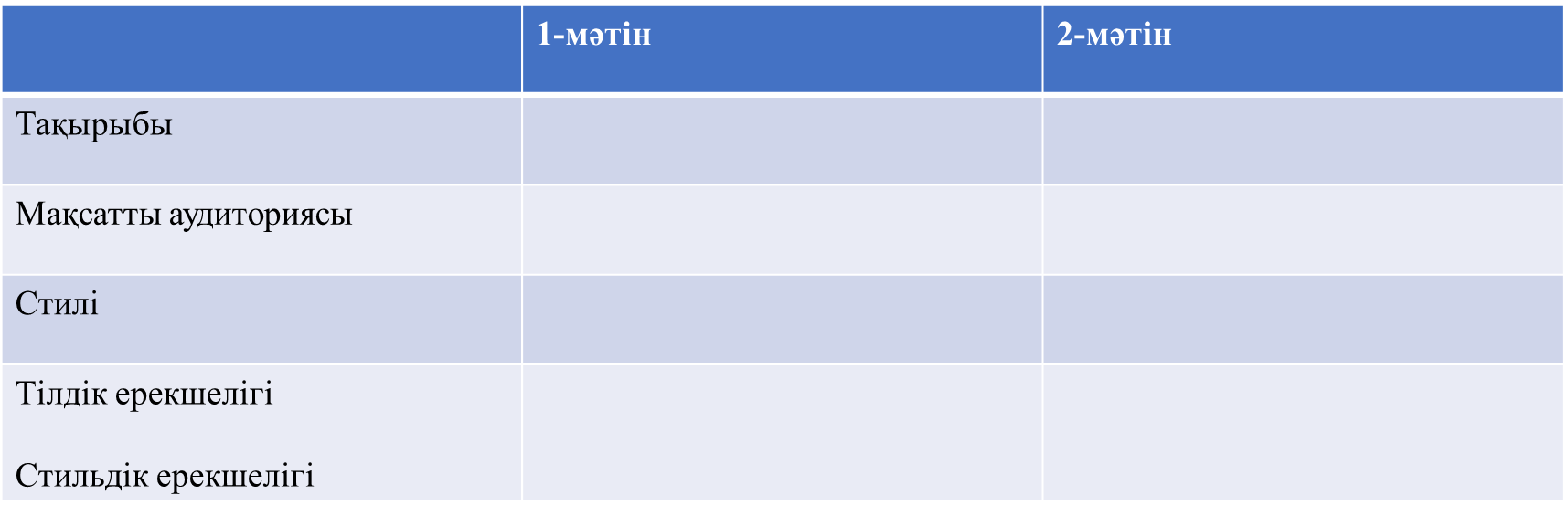 1 2-тапсырма. Мәтіндерді салыстырып, тақырыбын, мақсатты аудиториясын, стилін, тілдік ерекшелігін,стильдік ерекшелігін талдайды.