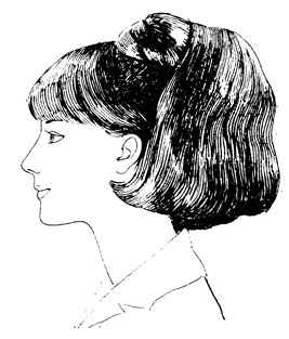 В конце 50-х - начале 60-х годов распространяется прическа, созданная парикмахерами Германской Демократической Республики, - "колокол", получившая это название за свой силуэт, напоминавший колокол. С распространением этой прически меняется цвет волос - становятся модными цвет бронзы, платины, латуни, меди. В прическах преобладают красные, желтые цвета разных оттенков. В это же время распространяются небольшие, аккуратные прически типа "клевер", "кошачьи ушки", "пони" (рис. 112). Эти прически распространяются по всему миру, претерпевая некоторые изменения в зависимости от страны. В это время парикмахеры при создании причесок используют прием тупирования волосяных прядей, благодаря чему прическа получает высоту, более устойчивый, тяжеловесный силуэт. Появляются прически, получившие разные наименования благодаря своему силуэту, - "улей", "вспушенная голова", "сахарная голова", "бабетта". Стали использовать накладные волосы - шиньоны. Часто одна прическа состояла из двух-трех шиньонов. Молодые женщины и девушки 50-60-х годов XX века стали подражать модным прическам актрис французского кино - Брижитт Бардо, Марины Влади. Длинные белокурые волосы, свободно падающие на спину и плечи, надолго вошли в моду. Но нельзя сказать, чтобы все носили одинаковые прически, многие "донашивали" прически 40-х годов - с валиками, коками, перманентом, косами.