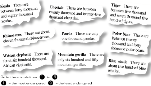 (Students see the picture of the animal on the screen and find the appropriate information in the text). (a tiger, an elephant, a rhinoceros, a panda, a whale, a mountain gorilla, a polar bear, a koala) Make a list of the most endangered and the least endangered animals.