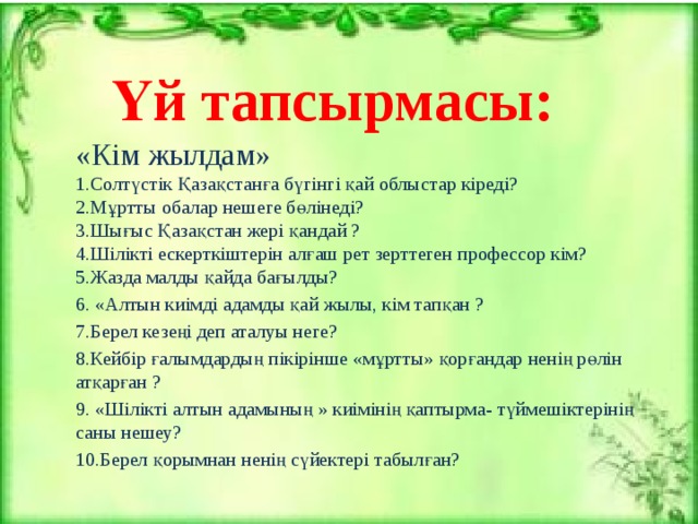 Жаңа сабақты қорытындылау : 1. Көне дәуір авторларының еңбектерінде «сармат» атауының кездесетін мерзімі А) б.з.б. Үғасыр В) б.з.б. ІҮ ғасыр С) б.з. ІІ ғасыры Д) б.з.б. ІІІ ғасыр 2. Елімізде сарматтар қоныстанған аймақ А) Оңтүстік Қазақстан В) Солтүстік Қазақстан С) Батыс Қазақстан Д )Шығыс Қазақстан 3. Сармат тайпаларының өмір сүру мерзімі А) б.з.б. Ү ғ.-б.з. І ғ. В) б.з.б. ҮІІІ ғ.-б.з.Ү С) б.з.б.ҮІІ ғ.-б.з. ІІІ ғ. Д). б.з.б. ҮІ ғ.-б.з. ІІ ғ. 4. Арал-Каспий аралығы, одан оңтүстікке қарай өмір сүрген сармат тайпасы А) Каспий В) Гиркан С) Саврамат Д) Дах 5. Каспий жағалауында өмір сүрген сармат тайпасы А) Гиркани В) Алан С) Савромат Д) Дах 6. Сармат дәуіріндегі Каспий теңізінің атауы А) Хорезм В) Исседон С) Гиркан Д) Дах 7.Сарматтар кімдермен туыстас болып келеді? а)сақтар В) массагеттермен, исседондармен с)Дайлармен D) исседондар Жауабы: 1-д 2-с 3-в 4-д 5-а 6-с 7-в |