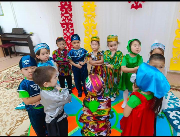 Муз залға Әр бала 3 ұлтқа бөлініп (өзбек, қазақ, орыс) киімдерін киіп кіреді.