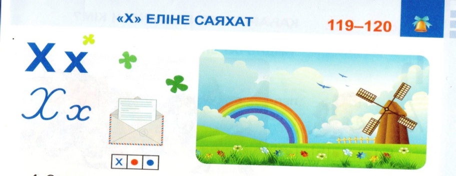 Қызығушылықты ояту Сөздің сыры көп жұмбақ Шешуін кім табады? Кім шешсе тез ойлап, Сол жеңімпаз болады? Аяғы жоқ, -жүреді Аузы жоқ,- сөйлейді . (хат) Сәлем алып алыстан Туысыңнан, таныстан Келетұғын хат хабар, Қай әріптен басталар? (Х) Қайшы ашасын ашса, «Х» әрпіне ұқсайды. Х – дауыссыз , қатаң дыбыс Х- сөздің басында, ортасында, соңында келеді. Х- тіл арты, ызың, қатаң дауыссыз дыбысты белгілейтін әріп. Араб, парсы, орыс тілдерінде көп қолданады. Оқулықпен жұмыс, сөздерді оқу Бүгінгі сабақта «Х» еліне саяхатқа шығамыз. Суретте «Х» әрпіне ұқсас фигураларды табу. Кемпірқосақ -))), желдиірмен- Х