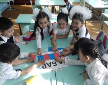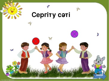 Шаттық шеңбер: Қоңыраудың сиқырлы, Естіледі сыңғыры. Қолыңды бер дейді, Шеңберге кел дейді. Бәріміз шеңбер құрайық, Біз білімді шыңдайық. Күн сәулесін шашайық. Ойын: «Сөз ойла,тез ойла». (сұрақ, жауап әдісі арқылы,құрылымдалған ойын). Шарты:Сөзді буынға бөлу,сөйлем құрастыру, өткен сабақты пысықтау. |
