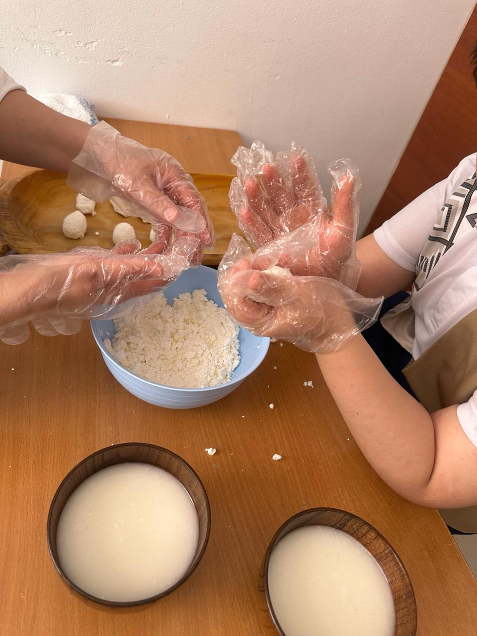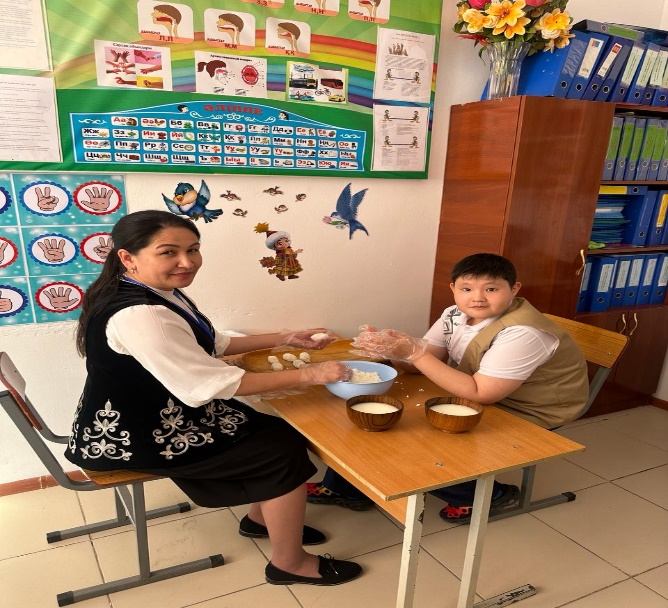 Ұлттық құндылықтарымызды бала бойына сіңіру мақсатында «Құрт жасау» әдісіне кәдімгі сүзбені бала саусақтарымен мыжып, екі алақанында ысқылау арқылы құрт жасаттым. Мақсаты: сенімділік, дәм сезу және түсін, пішінің тану. Бұдан шыққан нәтиже: баланың өзіне деген сенімділігінің артуы (яғни ол өзінің жасаған құртын көріп) және қол саусақтарының икемділігі.
