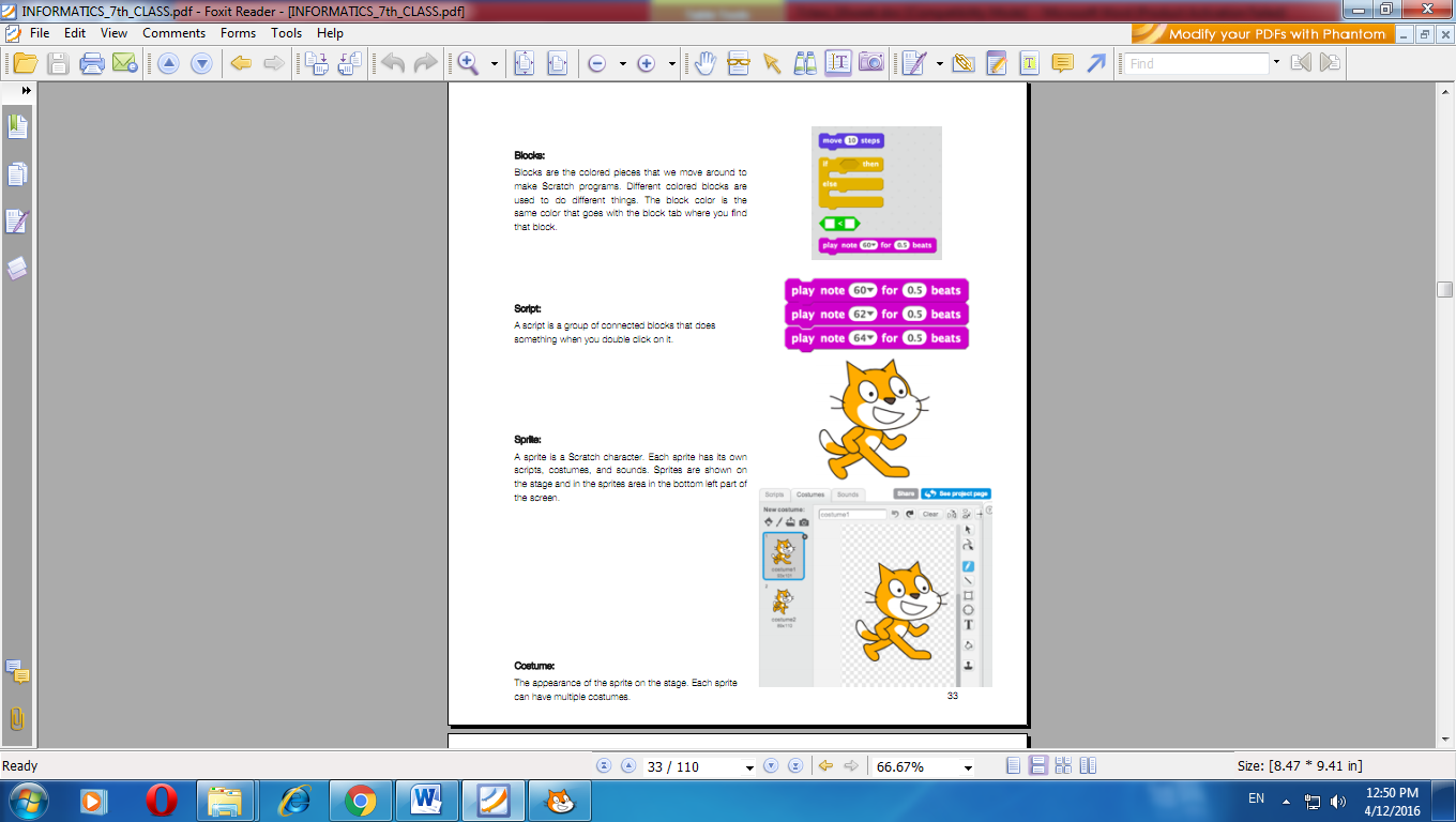 B Blocks are the colored pieces that we move around to make Scratch programs. Different colored blocks are used to do different things. The block color is the same color that goes with the block tab where you find that block. Script: A script is a group of connected blocks that does something when you double click on it Sprite: A sprite is a Scratch character. Each sprite has its own scripts, costumes, and sounds. Sprites are shown on the stage and in the sprites area in the bottom left part of the screen. Costume: The appearance of the sprite on the stage. Each sprite can have multiple costumes. Stage: The stage is in the upper left part of the Scratch editor. This is where you can see what happens when you run your scripts. |