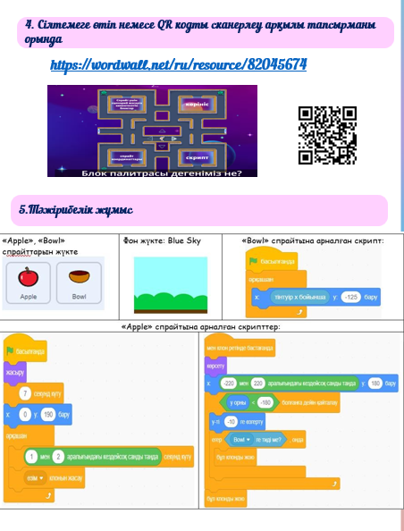 3.4.2.3 Scratch (скретч) программалау ортасында бірнеше кейіпкерлер құру; 3.4.2.4 Scratch (скретч) программалау ортасында ойындарды құру кезінде қайталау алгоритмін іске асыру |