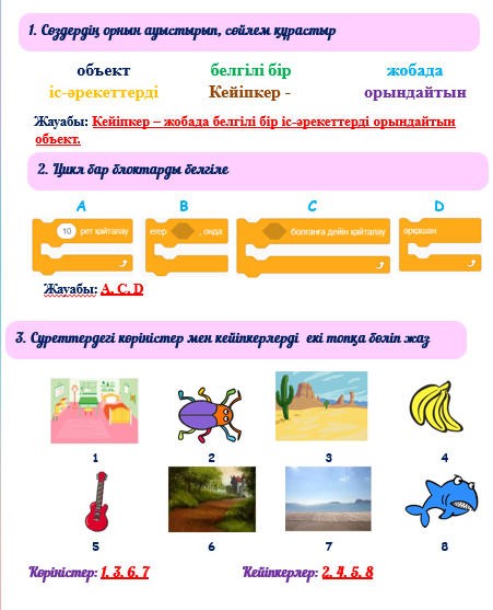 Әр оқушы топта оқыған мәтінін талқылайды. Олар бір-біріне және мұғалімге сұрақтар қою арқылы білімдерін толықтырады. Жаттығулар орындайды - сөйлемді құрастырады - жауапты таңдайды - көріністер мен кейіпкерлерді ажыратады - интерактивті тапсырманы орындайды спрайттарды қосады. спрайттарға скирпт құрастырады |
