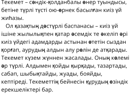 Біз қазір сендермен бастыру әдісі арқылы текемет жасаймыз. Ол үшін бізге жүн, сусабын, мата қажет.