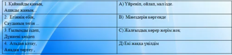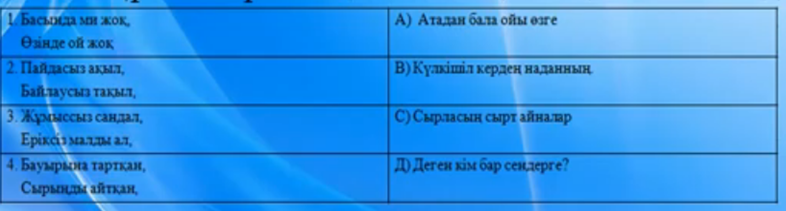 Дескриптор: өлең жолдарын сәйкестендіреді-1 мазмұнын ашады-1