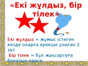 «Мәңгілік ел» жалпы ұлттық идеясының «қазақстандық патриотизм және азаматтық жауапкершілік», «құрмет, ынтымақтастық, ашықтық», «еңбек және шығармашылық» құндылықтары. |