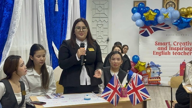 Ағылшын тілі пәні мұғалімі Тогызбаева Айдана жұмыс барысын таныстырып, мұғалімдермен топты таныстыру, зейінді мұғалім, озық ойлы мұғалім, ойлан және тап тапсырмаларымен сайысты жүргізді.