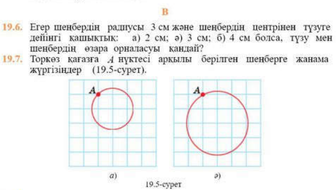 Түзу мен шеңбердің ортақ нүктесі жоқ болса олар өзара қалай орналасады ? - Түзу мен шеңбердің бір ортақ нүктесі болса олар өзара қалай орналасады ? - Түзу мен шеңбердің екі ортақ нүктесі жоқ болса олар өзара қалай орналасады ? - Осы түзулердің қайсысын «жанама», қайсысын «қиюшы» деп атауға болады, не себепті? - Жанамаға қандай анықтама беруге болады? - Қиюшыға қандай анықтама беруге болады? - Шеңбер мен түзудің өзара орналасуы қандай шамаларға тәуелді болады? |