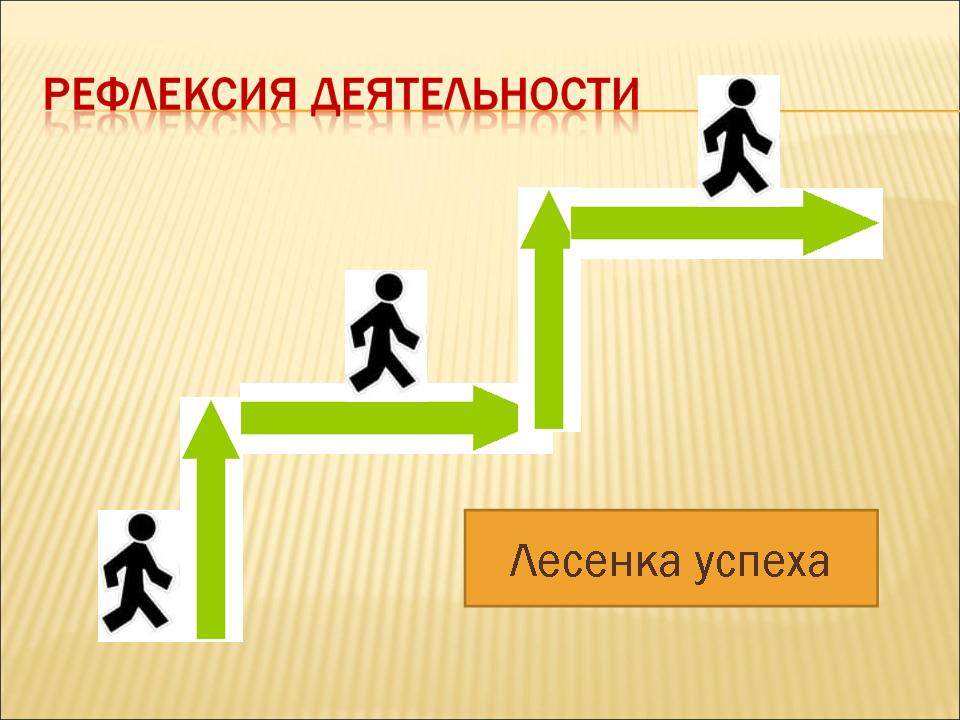 Рефлексия: «Лесенка успеха» – нижняя ступенька, у «человечка» руки опущены – у меня ничего не получилось; - средняя ступенька, у «человечка» руки разведены в стороны – у меня были проблемы; - верхняя ступенька, у