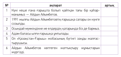 Мәтін бойынша «Қос жазба» күнделігін толтырады, түсіндіреді. 1. Жұлдызды қалашық қайда орналасқан? 2. Ол жерде ғарышкерлер немен айналысады? 3. Мұхтар Аймаханов кім? 4. Қазіргі кезде Мұхтар Аймаханов немен айналысады? 5. Ғарышқа ұшудың кезегінде тұрған ғарышкер үшін ең ауыр нәрсе не? |