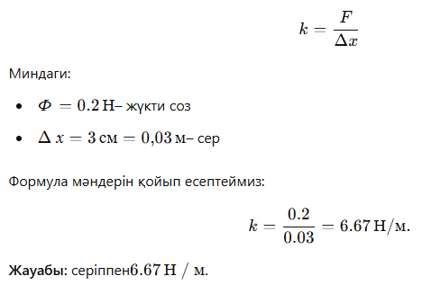 2.Ауырлық күші 0,2 Н жүкті динамометрге ілгенде оның серіппесі 3 см-ге созылды. Серіппе қатаңдығын анықтаңыз Дескриптор: Білім алушы -серіппенің ұзаруын есептейді; -Гук заңын қолданады; -серіппенің қатаңдығын есептейді; -М дененің массасын анықтайды. |