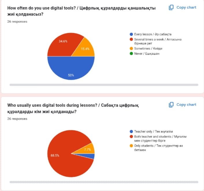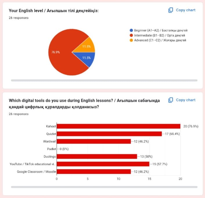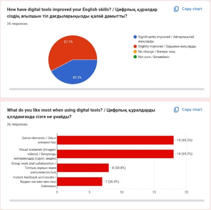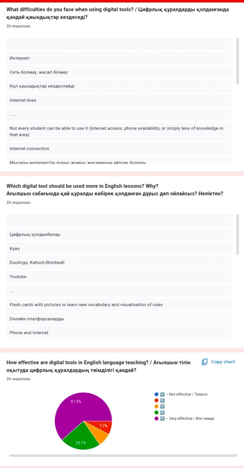 Data Analysis: Students’ performance and engagement were analyzed both qualitatively and quantitatively, comparing pre- and post-intervention results to determine changes in motivation, participation, and language proficiency.Additionally, the analysis and comparison methods were employed to identify differences between digital-assisted lessons and traditional approaches. Information from articles, textbooks, and case studies was organized into thematic sections using systematization and interpretation methods, providing a clear understanding of the pedagogical impact of digital tools.