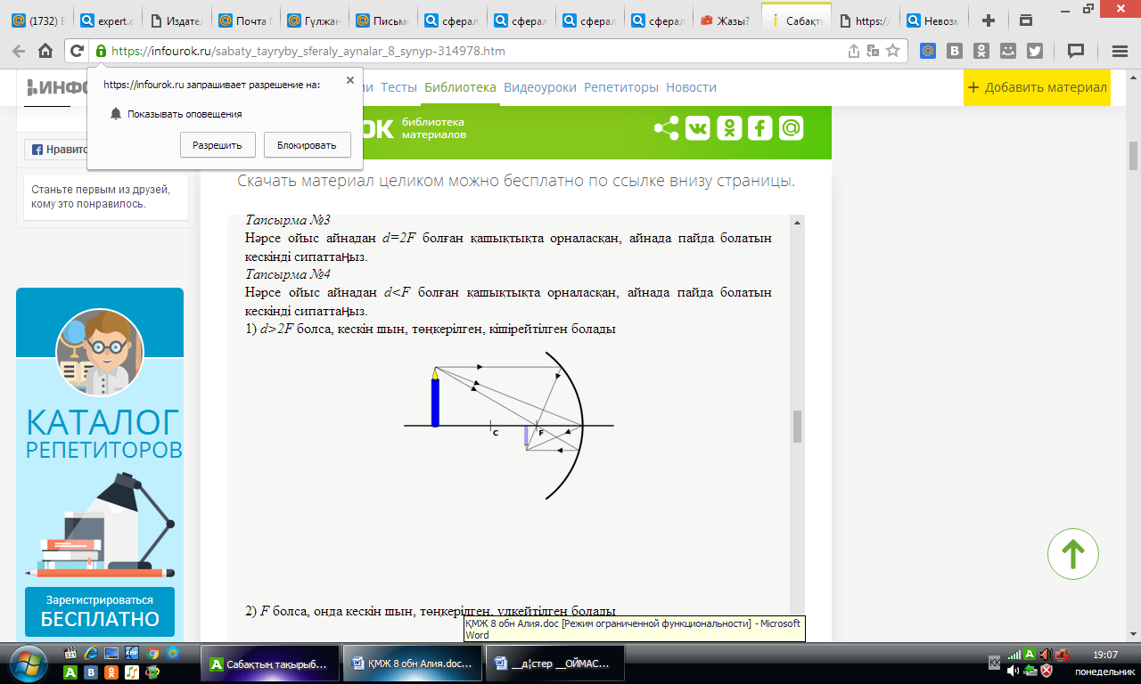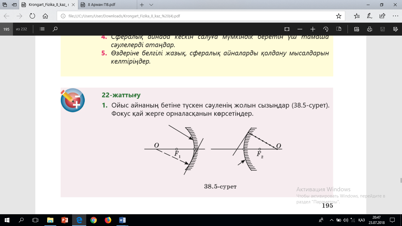 8.5.1.5 – дененің кескінін алу үшін сфералық айнада сәуленің жолын салу және алынған кескінді сипаттау |
