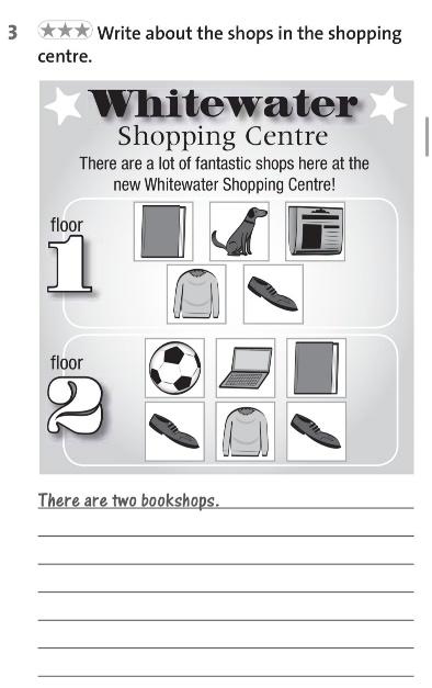 Students match 1 – 6 with a – f. then listen and check. ANSWERS: 1 c 2 e 3 a 4 f 5 b 6 d ANSWERS: There are two bookshops. There are three shoes. There are two jacket. There is a dog. There is a magazine. There is a ball. There is a laptop. Ss work in groups, learners do a task with stickers. Aim: improve and work with spelling. Efficiency: Ss use own vocabulary and practice it with groupmates. |