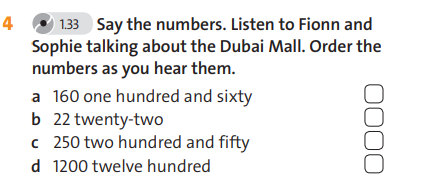 Say the numbers.Listen to Fionn and Sophie talking about the Dubai Mall. Order the numbers as you hear them.