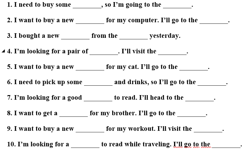 9. I want to buy a new ________ for my workout. I’ll visit the ________.