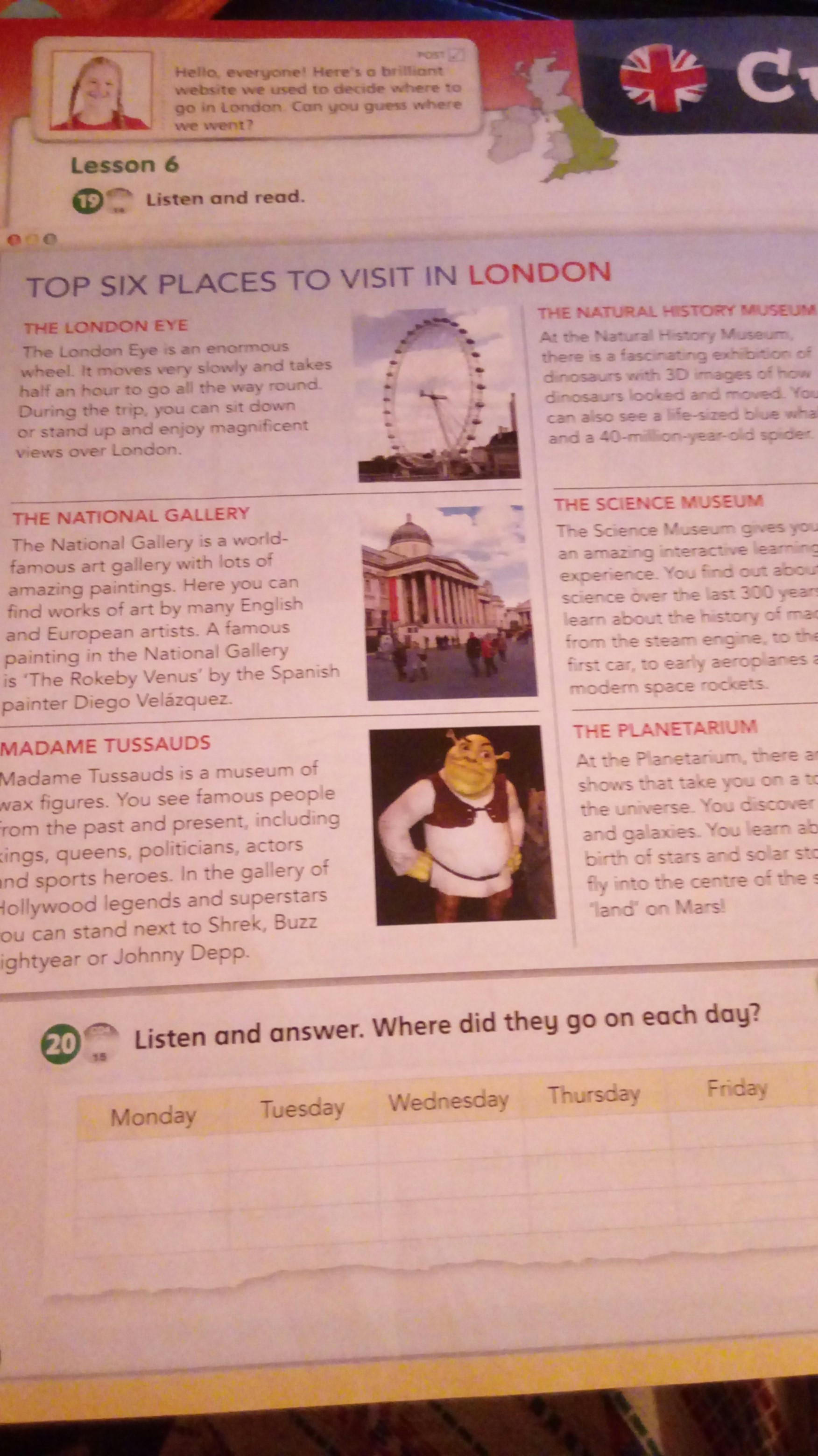 Greeting: Good day, dear learners! Nice to meet you How are you? Thank you, sit down. Are you ready for today’s lesson? Who is absent today? Who is on duty today? What is the weather like today? I . Organizing moment Divide the students into 3 groups Group I – Astana Group II – London Group III – Paris Vocabulary:street,bank,bus station,cinema,hospital,library,market,park,sports centre,road,city,river. Reading SBpg70.Ex19.Top six places to visit in London. Pupils read and translate