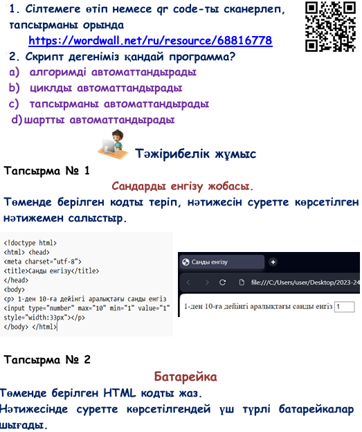 Оқушылар топтарға бөлінеді Тапсырманы орындайды Дескрипторлар: - тапсырманы орындайды - дұрыс жауапты таңдайды - бағдарлама кодын тереді, нәтижесін салыстырады - HTML- кодын тереді, нәтижесін салыстырады |