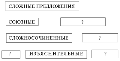 Это задание развивает умение систематизировать, обобщать материал, делать самостоятельные выводы. Помня о необходимости развития монологической речи учащихся, можно дополнить задание: «Прочтите слепую схему. Расскажите о строении сложных предложений». «Слепая» схема № 2 (для второй группы) Придаточные предложения бывают: ОПРЕДЕЛИТЕЛЬНЫЕ ? ОБСТОЯТЕЛЬСТВЕННЫЕ ? ПАДЕЖНЫЕ ВОПРОСЫ ?