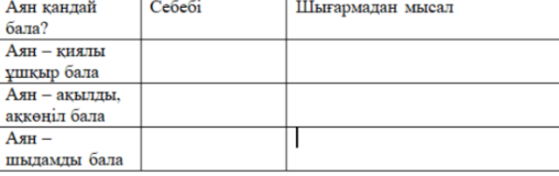 Ұйымдастыру кезеңі Амандасу. Оқушылармен амандасу, қатысуын түгендеу. Психологиялық ахуал қалыптастыру Мен тапқырмын немесе мен ақылдымын Оқушылар тек тақ сандарды айтуы тиіс, жұп санға кезек келген кезде мен тапқырмын немесе мен ақылдымын деп екі сөздің бірін айтулары қажет. Оқушыларды топқа бөлу Кейіпкерлер мінезі арқылы топқа бөлу. Оқушыларды киіз үй бейнеленген қима сурет арқылы 3 топқа бөлемін. 1-топ: «Намысшыл» тобы 2-топ: «Шыншыл» тобы 3-топ: «Жанашыр» тобы Сабақтың тақырыбы мен оқу мақсаты, бағалау критерийлері хабарланады. Үй тапсырмасын пысықтау. “Ой толғаныс” Интерактивті тақтадан хат, кітап, жусан, шанамен ойнап жүрген балалардың суреті көрсетіледі. Оқушылар сол сурет арқылы кейіпкерлерге талдау жасайды. Мысалы: кітапты көрген сәтте есіме Аянның ертегі айтқан сәті келді. Оқушыларды жаңа тақырыппен, оқу мақсатымен таныстырамын. Топтық жұмыс 1-тапсырма. 1-топ: “Намысшыл” тобы