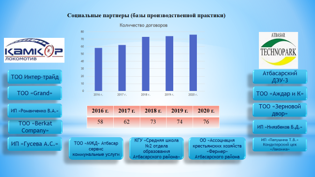 Основными социальными партнерами колледжа на протяжении продолжительного времени являются: филиал «Атбасарский электровозоремонтный завод» ТОО «Камкор Локомотив», ТОО «Аждар и К», АО «НК» «КТЖ»- «Укрупненная Атбасарская дистанция пути», ТОО «Пассажирские перевозки», рестораны «Бейбарс», «Канагат», «Армандастар», ТОО «Арэк-Энергосбыт», ТОО «Atbacar Technopark», кондитерская ИП «Папушина Т.В», салон красоты «Салтанат»,ТОО Интер-трайд, ТОО «Grand», ИП «Романченко», ТОО «Зерновой двор», Ассоциация крестьянских хозяйств «Фермер»,Атбасарская ДЭУ-3, а также сеть кафе и пунктов общественного питания, сельхозтоваропроизводители Атбасарского и прилегающих районов и другие предприятия города.