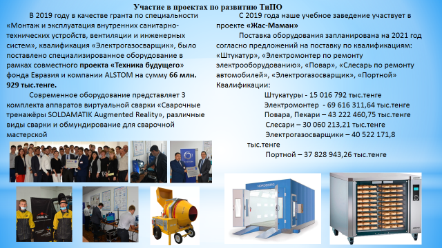 В 2019году в качестве гранта по специальности «Монтаж и эксплуатация санитарно-технические устройств, вентиляции и инженерных систем» квалификация «Электрогазосварщик» было поставлено специализированное оборудование в рамках совместного проекта «Техника будущего» фонда Евразия и компании АLSTOM на сумму 35 млн. тенге.