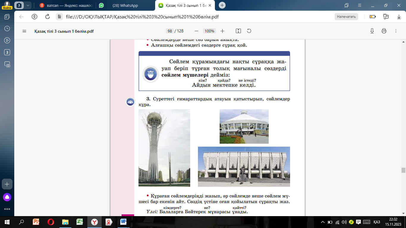 3 –тапсырма Жеке жұмыс «Құрастыр» әдісі Суреттегі ғимараттардың атауын қатыстырып, сөйлемдер құра. Құраған сөйлемдеріңді жазып, әр сөйлемде неше сөйлем мүшесі бар екенін айт. Сөздiң үстiне оған қойылатын сұрақты жаз. ЕББҚ Тапсырманы орындауда қолдау көрсету Талқылау сұрақтары: 1.тапсырманы орындауда не оңай,не қиын болды? |
