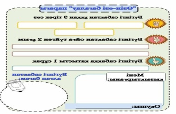 Сабаққа дайындық жасап, жақсы тілектер тілейді. Үй тапсырмасын пысықтайды Тапсырманы орындайды Мәтінмен жұмыс жасайды Жұмбақты шешеді Жаттығу жасайды Тапсырманы орындайды Үй тапсырмасын алады Қосымша жұмыс жасайды Кері байланыс жасайды |