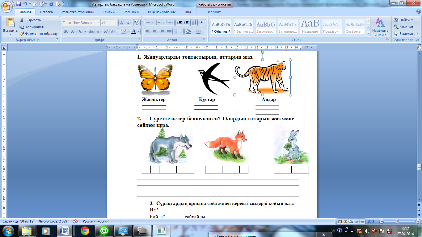 1. Жәндіктер, құстар, аңдардың суреттер қимасын 3 топқа үлесіріп беру. Оқушылар өздері ойланып жәндіктерді, құстарды, аңдарды класстары бойынша топтастырады. Олардың табиғатқа қандай пайдасы бар, олар қандай жерлерді тіршілік ететіндігін, қайда кездескендерін өмірмен байланыстырып әр топ өз жұмыстарын қорғайды.