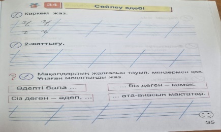 1.1.4.1 коммуникативтік қатынаста сөз әдебін (сәлемдесу,алғыс білдіру,кешірім сұрау,өтініш айту, рұқсат сұрау,қоштасу) дұрыс қолдану; 1.3.6.1 жазу жолын,жоларалықты,жолдың жоғарғы және төменгі сызықтарын сақтап,әріп элементтерін,әріптердің бір-бірімен байланысын көркем жазу талаптарына сай жазу |