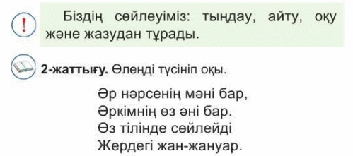 1-жаттығудағы сөйлемдерді оқиды. Мәтінде қандай ой айтылғанын суреттің көмегімен және мұғалімнің түсіндіруімен ұғынады. Қойылған сұрақтарға жауап береді.