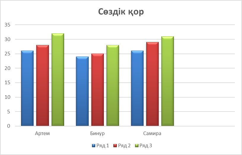 Самира 1 сабақта – 26, 3 сабақта – 29, 5 сабақта – 31 сөзді құрады. Самираның сөздік қоры 5 сабақ ішінде 5 сөзге өсті, бұл да тұрақты даму динамикасын көрсетеді.