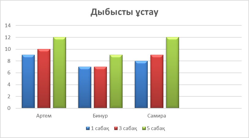 Екінші диаграммада бір керек дыбысты сөзде ұстап алу бойынша көрсетілген(Кесте 2). Оқушы ол дыбысты дұрыс естиді ме, оны қай бөлікте орналасқанын таный алды ма деген сұраққа жауап алуға болады. 12 сөзде берілген дыбысты естігенде шапалақтады. Артем 1 сабақта – 9, 3 сабақта – 10, 5 сабақта – 12. Артемнің дыбысты дұрыс қабылдау деңгейі 5 сабақ ішінде 3 сөзге өсті. Бұл көрсеткіштің өсуі оның тыңдау және дыбыстарды тану қабілетінің жақсарғанын көрсетеді. Бинурда 1 сабақта – 7, 3 сабақта – 7, 5 сабақта – 9 сөзді құрады. Бинурдың дыбысты қабылдау деңгейі 5 сабақ ішінде 2 сөзге ғана өсті. Бастапқы кезеңде оның нәтижелері тұрақты болды, бірақ кейінірек өсім байқалды. Самира 1 сабақта – 8, 3 сабақта – 9, 5 сабақта – 12 сөзздегі дыбысты қабылдап, шапалақтады. Самираның дыбысты қабылдау деңгейі де тұрақты өсті. Оның дыбысты есту және дұрыс тану қабілеті 5 сабақ ішінде 4 сөзге артты.