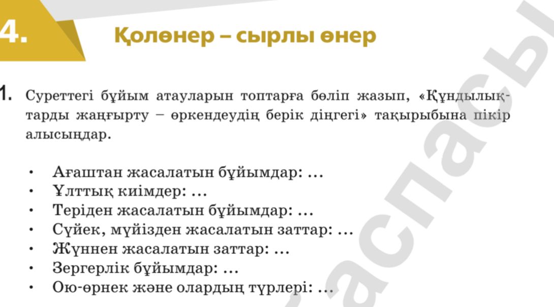 1)Суреттегі қолөнер бұйымдарын және ою-өрнектерді тауып,топтарға бөліп жазу керек./Need to find the handicrafts and patterns in the picture, then categorize and write them down. Қолөнер бұйымдарының атауларының аудармасын жазу керек./ You need to write the translations of 2) Ғ.Мүсіреповтың ана туралы айтқан сөзін табу қажет Тапсырманы “Тарсиа” әдісі арқылы жасау/Performing tasks by “Tarsia method” 3)Топтық жұмыс/Group work
