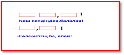 – Сәлем! Менің атым – Әдия. Сенің атың ше? – Сәлем! Менің атым – Алмас.