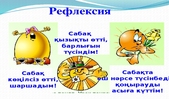 Тамаша! Суретпен жұмыс жасай алды Әңгімелеуді, дұрыс сөйлеуді,сөйлем құрауды меңгерді «Рефлексия» әдісі бойынша өз ойларын білдіреді |