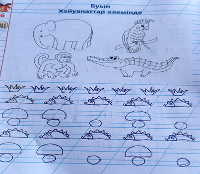 Қаз-бір буынды сөз Қас-қыр, түл-кі—екі буынды сөздер ЕБҚ Аңдардың суреттерінің ішінен өзіне таныс аңдарды теріп алып, оларды атау, аттарын буынға бөліп айтуға әрекеттену Жазылым Бала қолының ұсақ бұлшықеттерін дамыту үшін төменде берілген жазуға даярлау жұмыстарын басшылыққа алу: – заттарды сызықтар арқылы қосу; – дәптер бетіндегі суреттерді бояу; – үзік сызықтарды бастырып жүргізу.