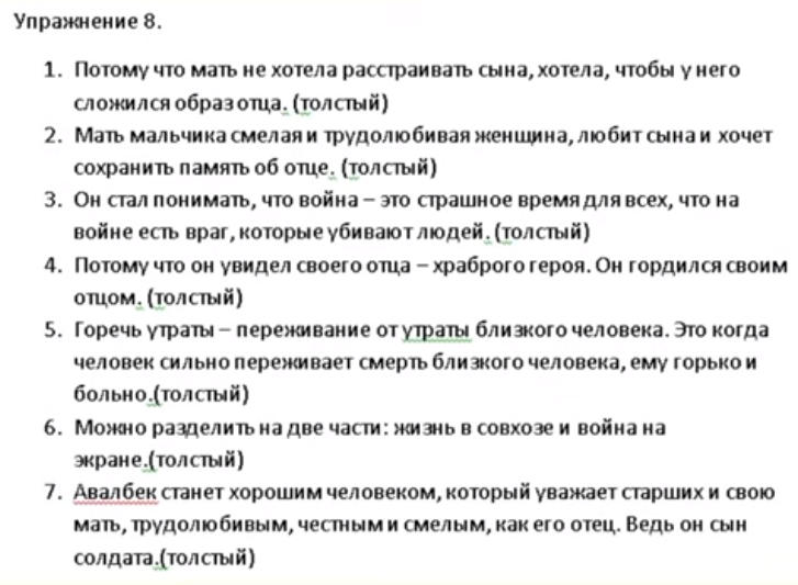 1) Потому что мать не хотела расстраивать мальчика, а хотела, чтобы - у него сложился образ отца (толстый). 2) Мать смелая и трудолюбивая женщина, любит сына и хочет сохранить память об отце, (толстый). 3) что война – это очень страшное время для всех, что на войне есть враг, гремят пушки, что на войне могут убить, (толстый). 4) Потому что он, наконец) увидел своего отца, и его отец - это храбрый солдат, Мальчик очень гордился отцом, (толстый). 5) Горечь утраты - Переживание опт утраты близкого человека от чело это особое психическое состояние человека, которое начинает и заканчивается в определенные периоды.6) Можно (война на экране и события в кино) и жизнь в совхозе. 7) Он станет хорошим человеком, который уважает старших и своих родителей, трудолюбивым и честным. |