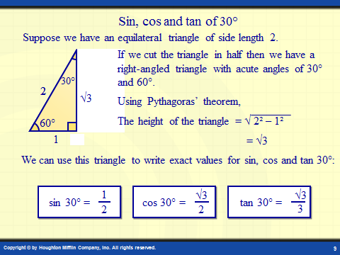 300, 450, 600 –тағы бұрыштарының синусы, косинусы, тангенсі, котангенсы мәндерін табады; 300, 450, 600 –тағы бұрыштарының синусы, косинусы, тангенсі, котангенсы мәндерін есеп шығару барысында қолданады. |