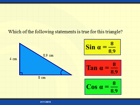 1. Тікбұрышты үшбұрыштың синусы дегеніміз не? 2. Тік бұрышты үшбұрыштың тангенсі дегеніміз не? 3. Пифагор теоремасының формуласы 4. Тікбұрышты үшбұрыш деп қандай үшбұрышты айтамыз? 5. Тік бұрышты үшбұрыштың элементтерін атаңыз. «Ширату» жаттығуы арқылы сабақтың оқу мақсатын ашу. The four trigonometric functions of a right triangle, with an acute angle α, are defined by ratios of two sides of the triangle.