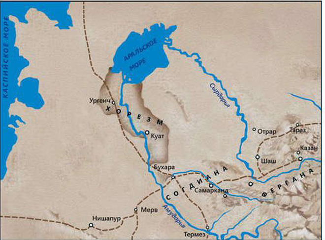 Окруженный со всех сторон песками крупный оазис в нижнем течении реки Амударьи во 2-м тысячелетии до н.э.. развитая ирригационная система каналов , берущих волу из Оса-Амударьи превратила этот оазис в крупный политический и культурный центр Центральной Азии уже в 1-м тысячелетии до н.э. Столицей государства стал город Топрак-Кала. Со временем государство пришло в упадок. Возрождение началось в средние века. Название государства сменилась на Хиву. |