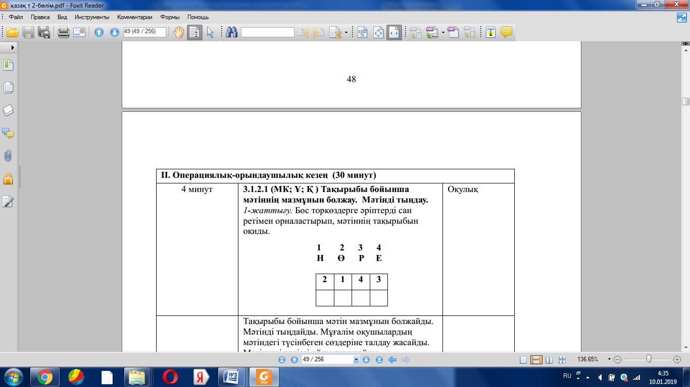 • Тыңдалған мəтін бойынша қойылған сұрақтарға жауап беріп, мəтінде жалпы не туралы айтылғанын түсінеді. • Диалогке қатысады; мұғалімнің көмегімен негізгі ойды анықтай алады. •Мәтін мазмұны бойынша пікір білдіруге, өз ойын дәлелдеуге және толық, жүйелі, түсінікті етіп айтуға, ойын жазбаша жеткізуге дағдыланады. |