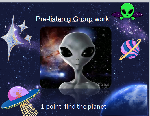 Listening T: Today we will journey to space: Pre-listenig Group work Look at the screen. What do you see on the screen? This alien will give you information about planets. You should guess which planet it tells about.
