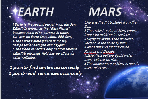 1 point- finds the planet 1 points-leaner finds sentences correctly 1 point-reads sentences accurately 1 point-gives correct answer 1 point- describes this place with one phrase 1 point-finds correct words 1 point reads the sentences accurately. 1 point-finds right word |