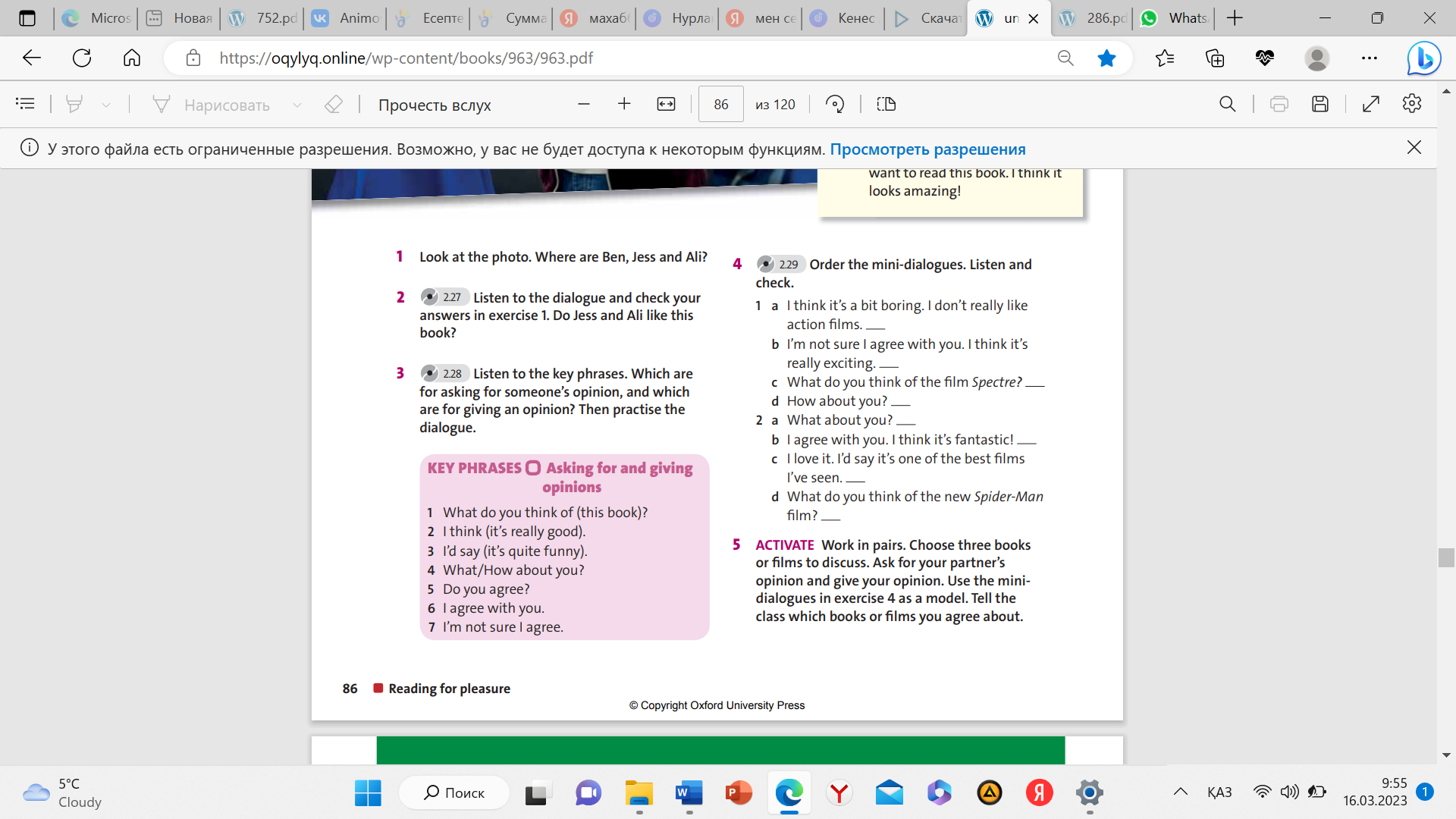 Speaking: Asking for and giving opinions. |